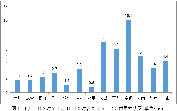 1月1日8时至11日8时全市平均面雨量4.4毫米,县级面雨量较大的有泰顺县10.1毫米,文成县7.0毫米,平阳县6.1毫米,苍南县5.0毫米。单站雨量较大的是泰顺县大际水库20毫米,杨寮19.5毫米,竹里19.5毫米。