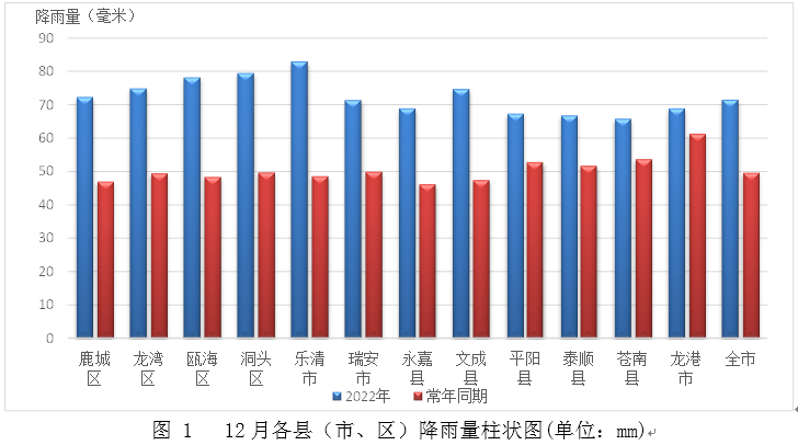 2022年12月1日8时至2023年1月1日8时全市平均面雨量71.5毫米,比常年同期(49.6毫米)偏多44%。县级面雨量较大的有乐清市83.0毫米,洞头区79.5毫米,瓯海区78.2毫米,龙湾区74.9毫米。全市过程雨量大于100毫米站点有33个,单站雨量较大的是永嘉县廊下138毫米,瓯海区绮云山125.5毫米,苍南县望州山122毫米。全市所有测站1小时雨量均未超过30毫米。